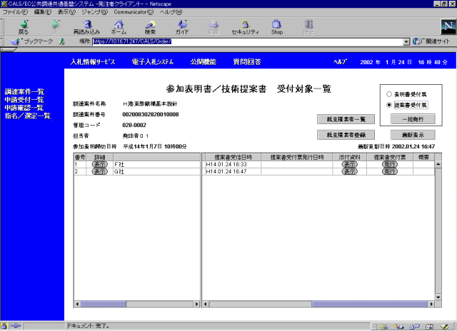 選択した案件に対して、提案書を提出している受注者の一覧が表示されます。
