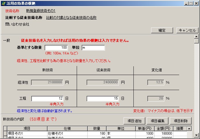 経済性及び工程で同程度以外を選択する場合は、「活用の効果の根拠」にて、新技術及び従来技術の内訳を入力して下さい。